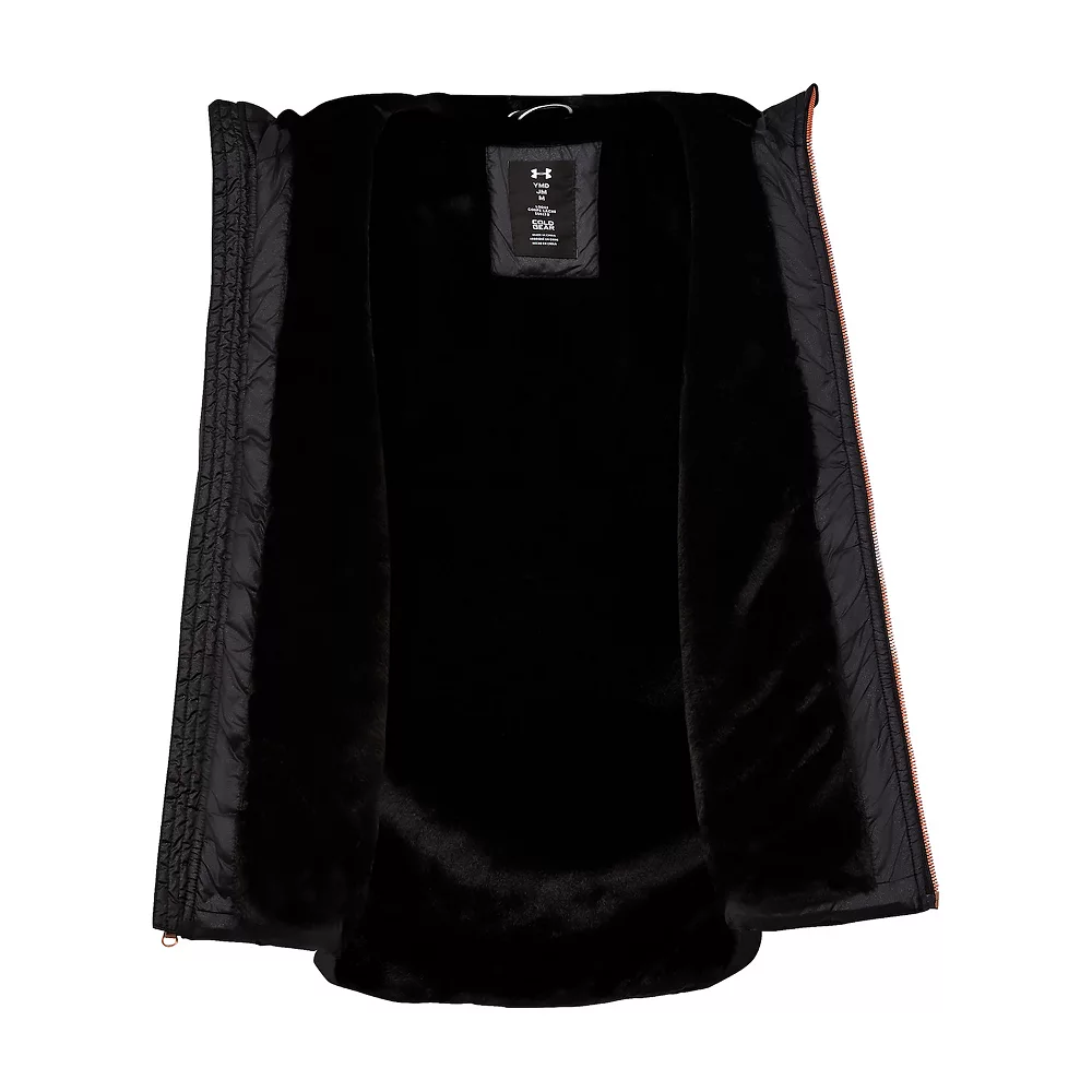 She’ll stay warm and dry without sacrificing style in this cozy girls’ knee length puffer coat from Under Armour.